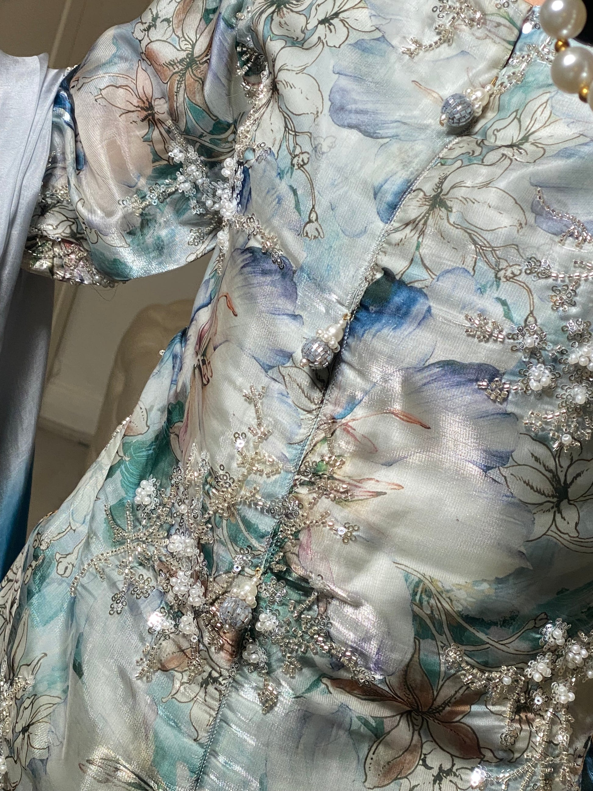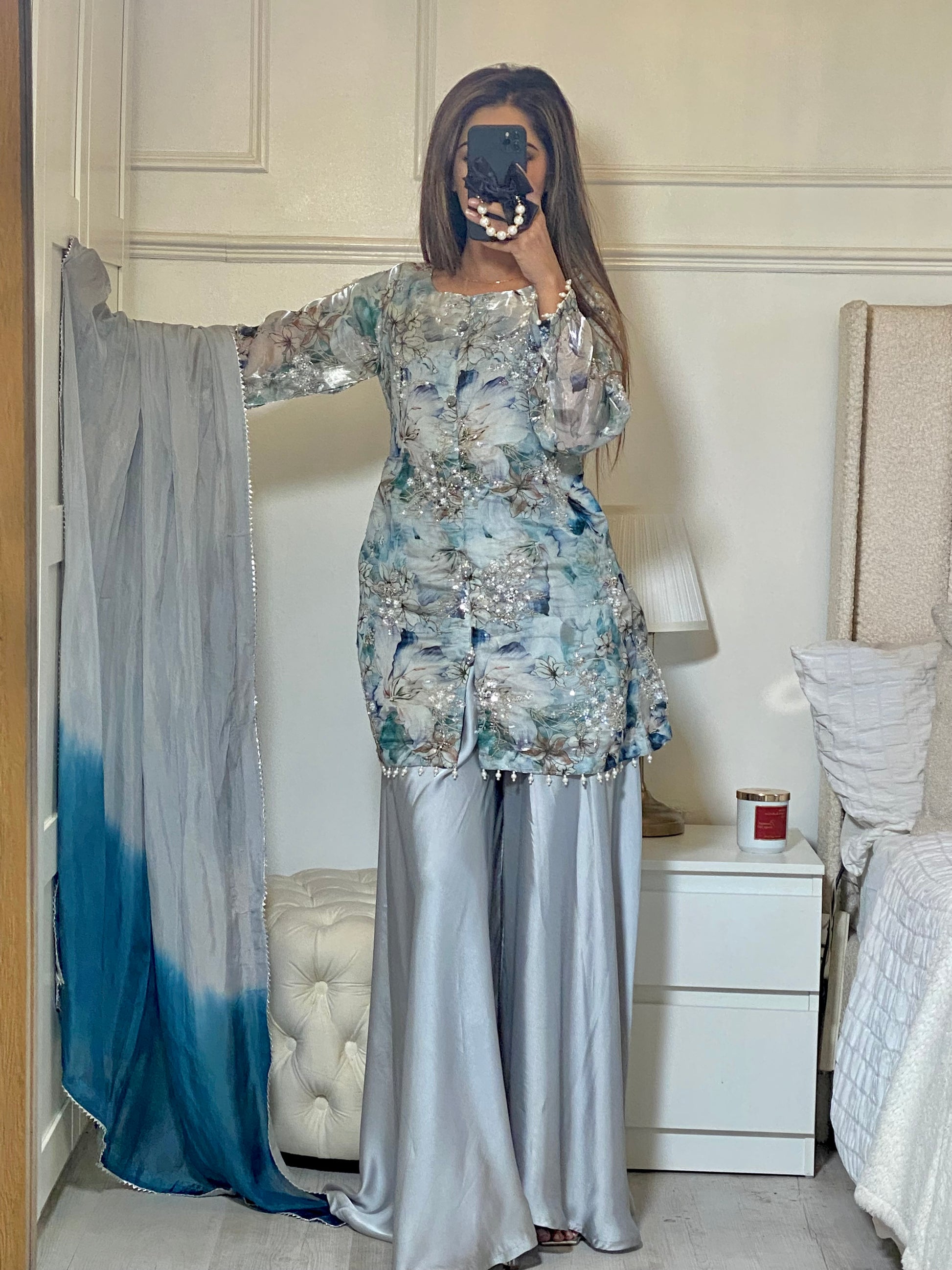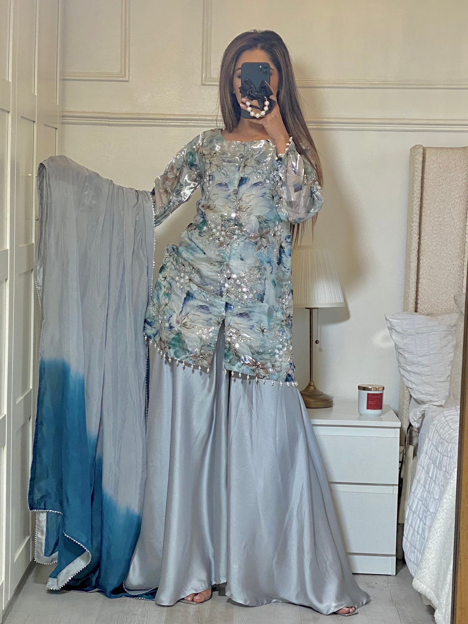 Silver lama silk jacket style kameez with blue floral print and embellishments. Detailed buttons with gems, pearl drop lace on the damaan and sleeve ends.
