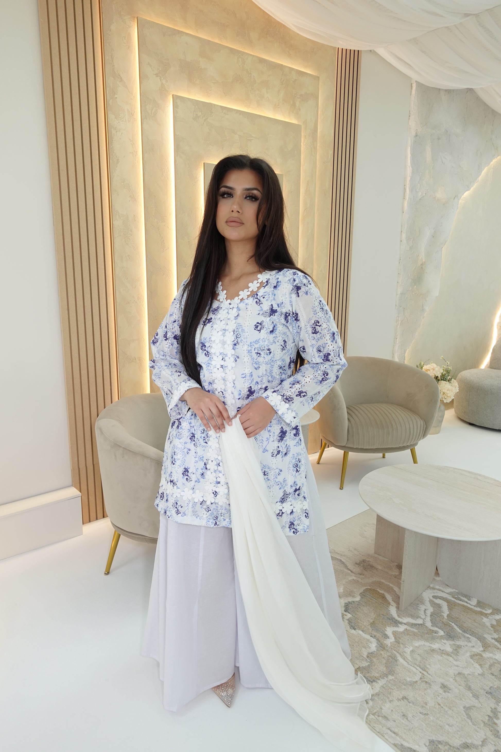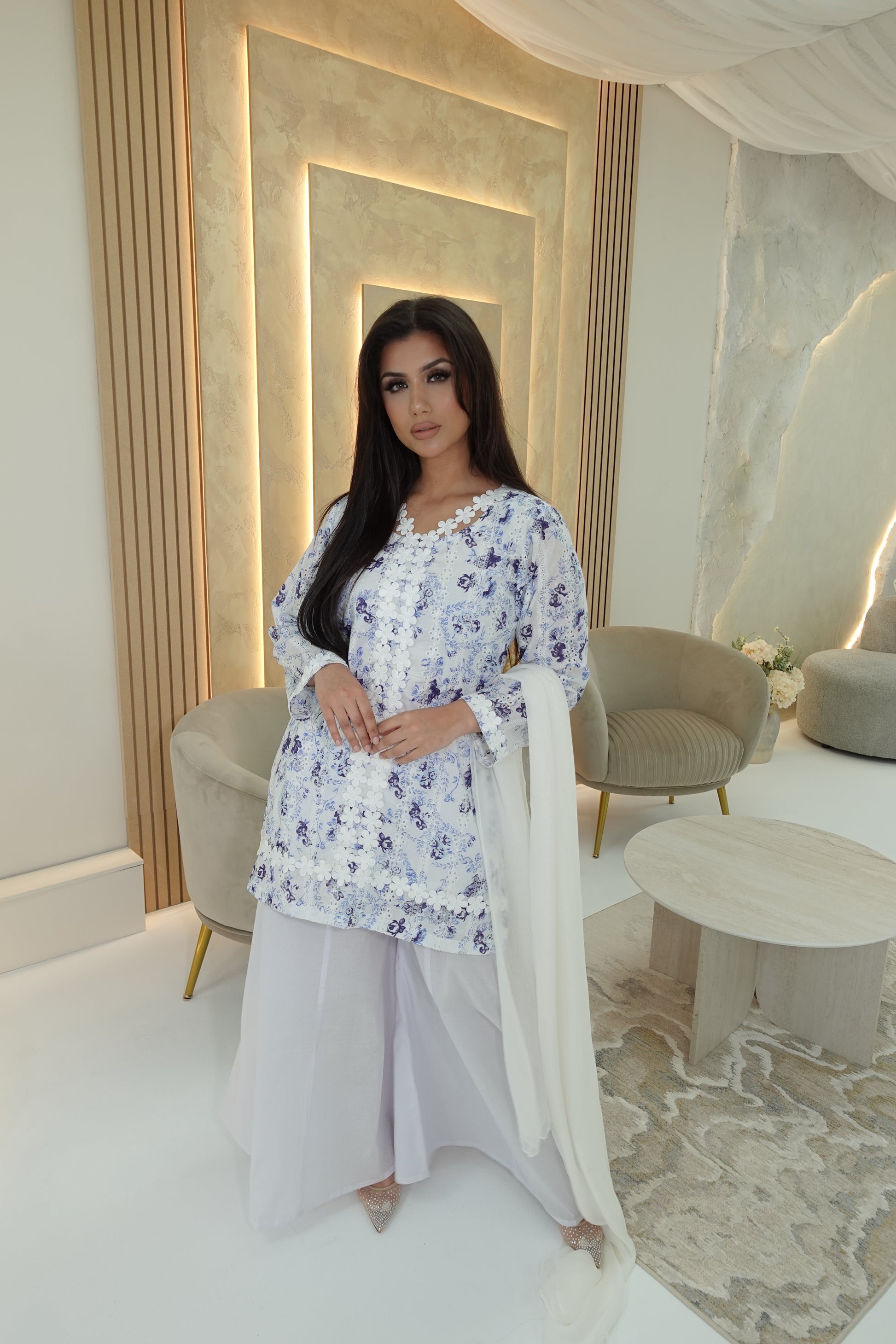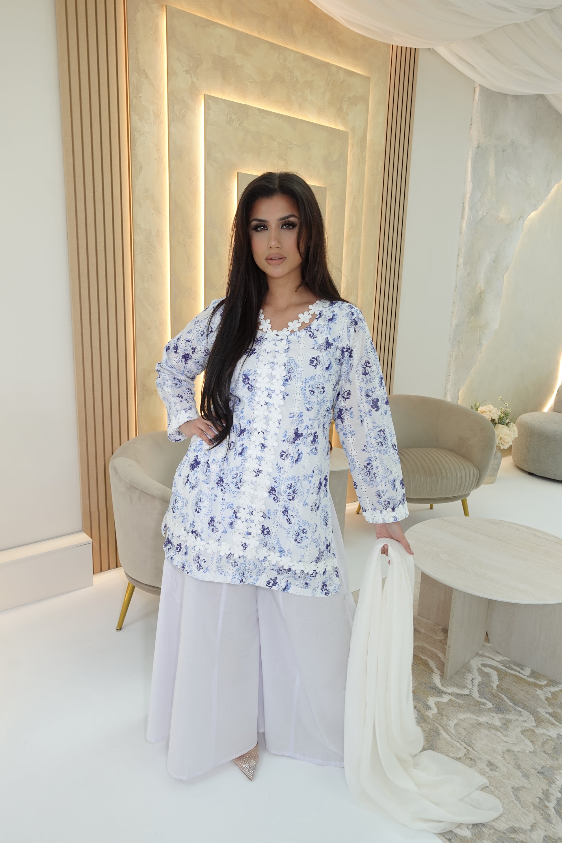 White chicken kari short kameez with blue printed flowers on the kameez. A floral lace on the neckline, kameez and sleeve ends.