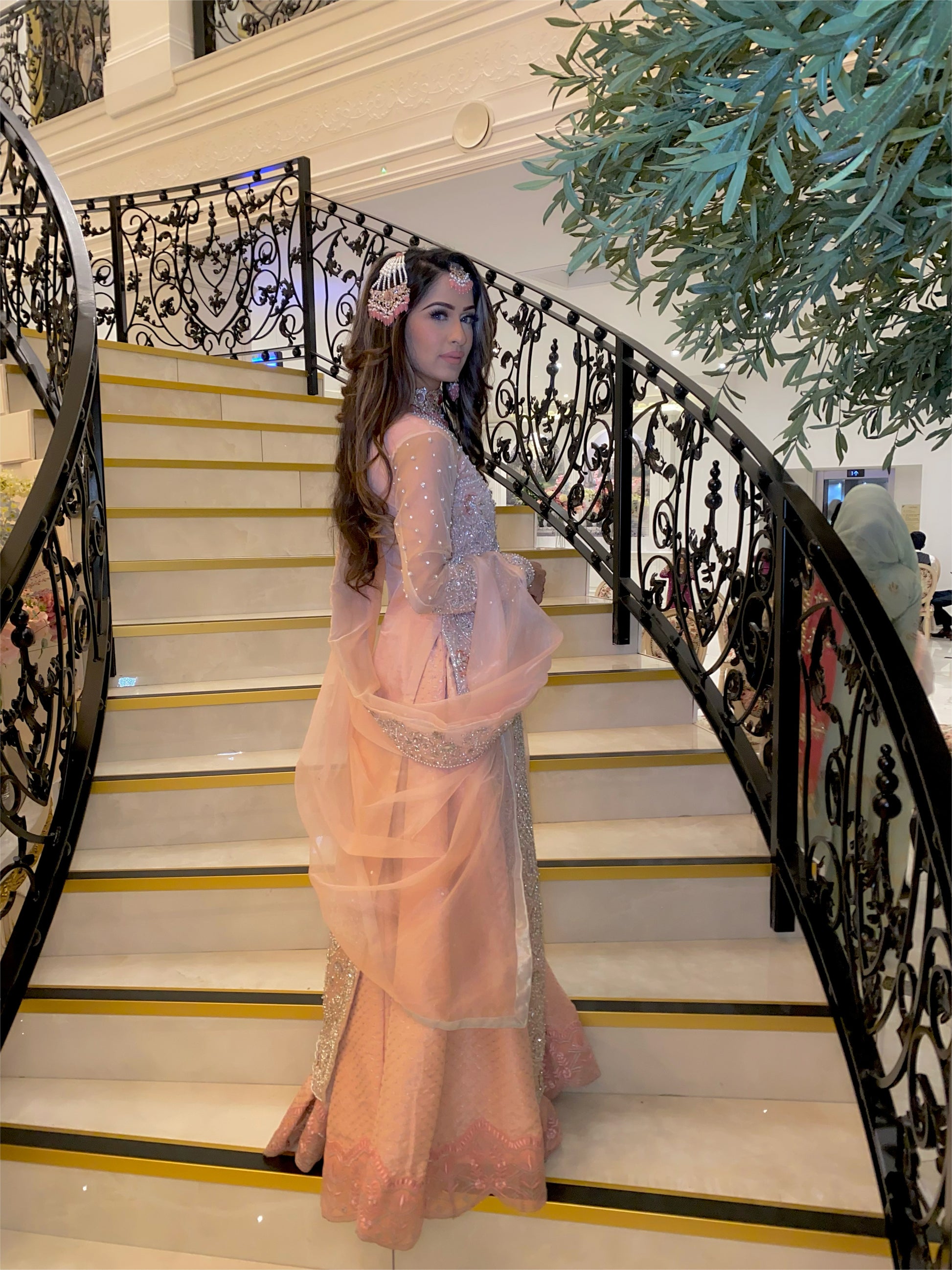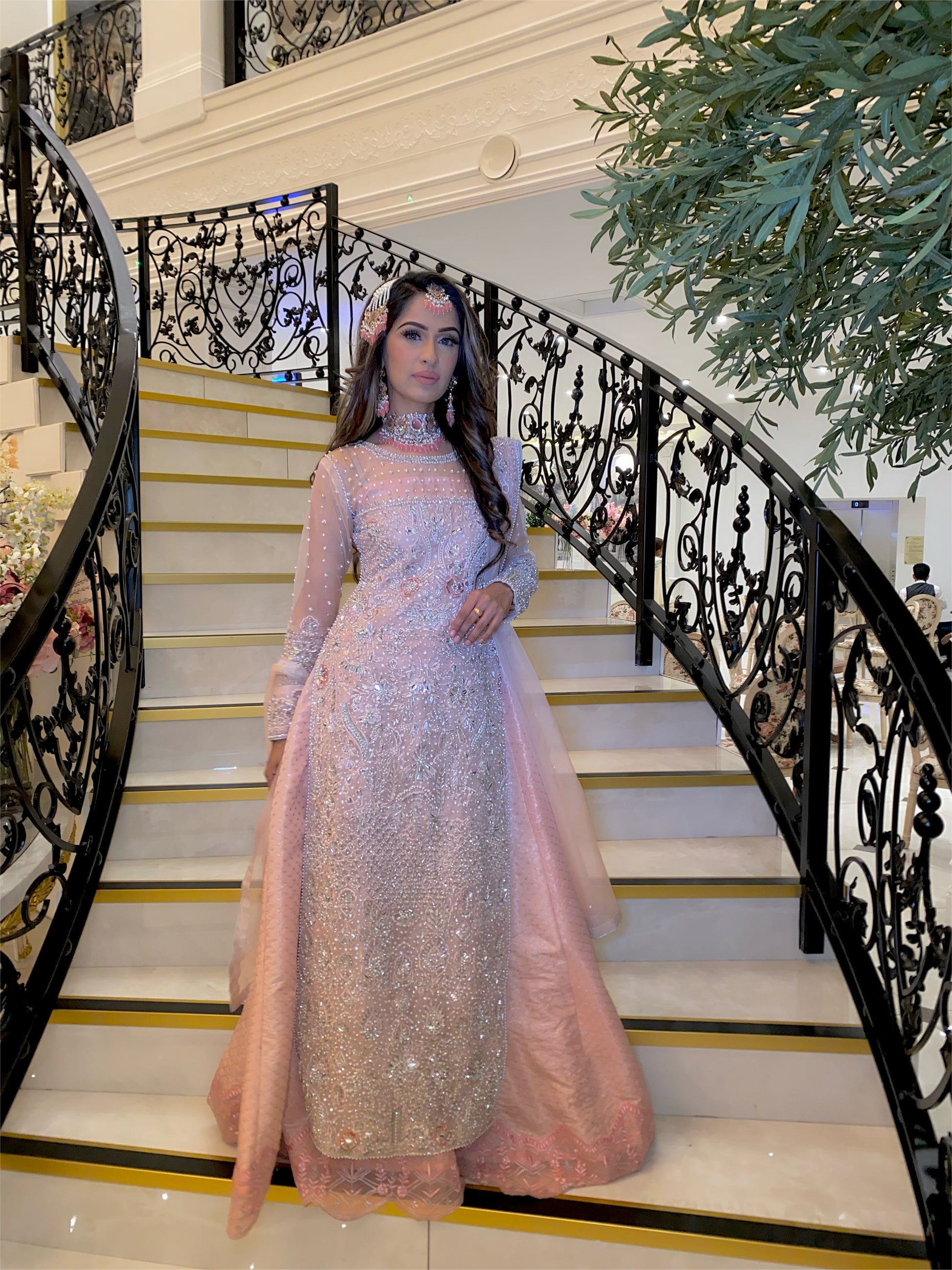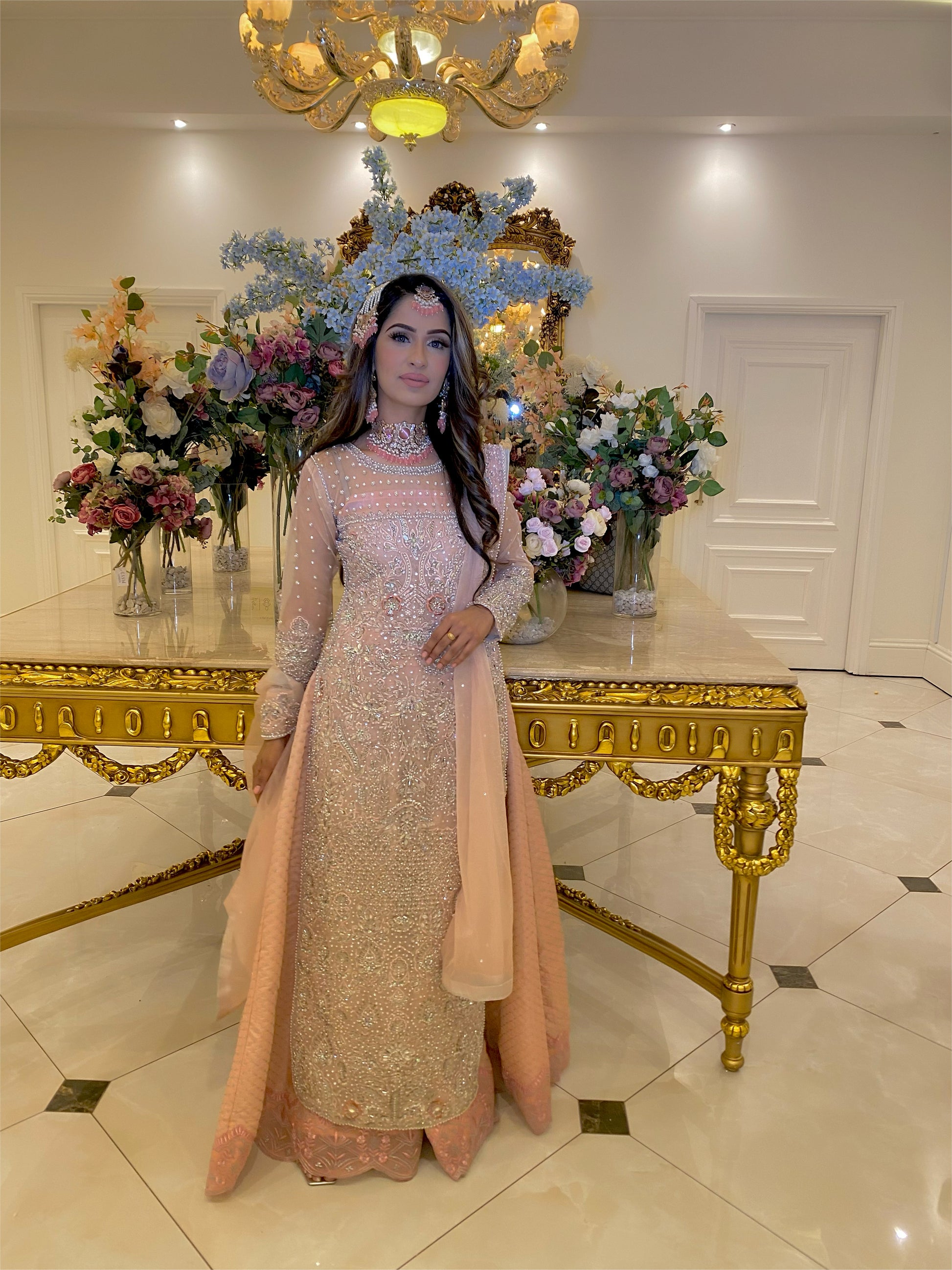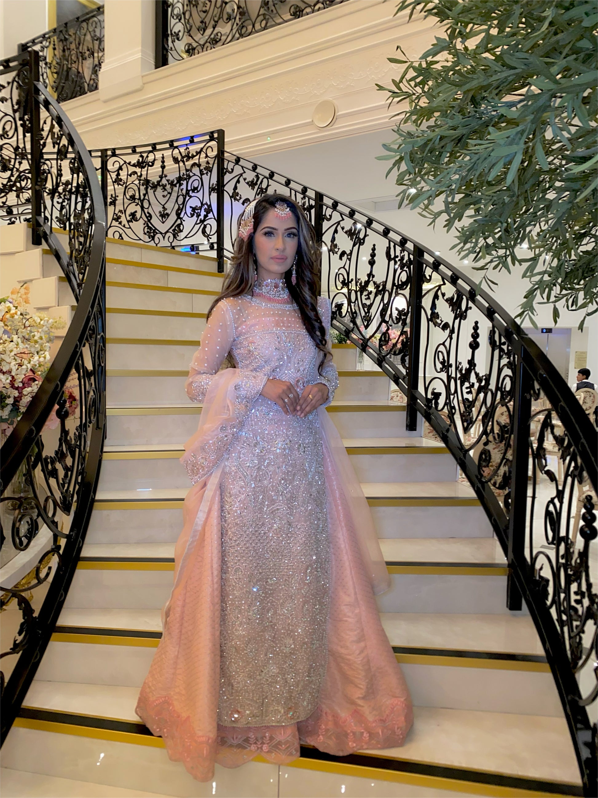 Pink silk long kameez with an organza neckline and sleeves. Fully embellished with hand embroidery on the front of the kameez, neckline and sleeves. The kameez also has a panel of hand embroidery on the back damaan.