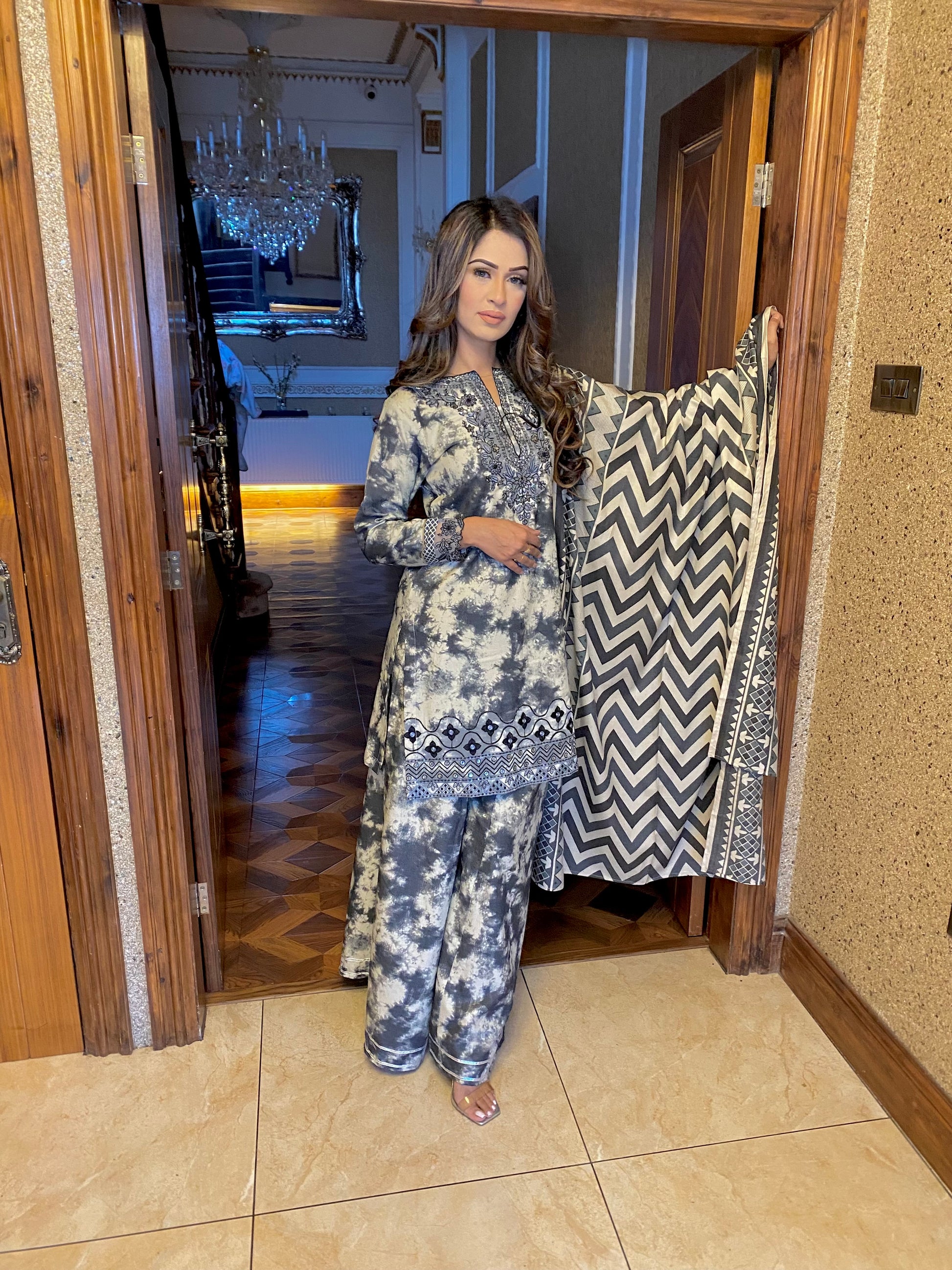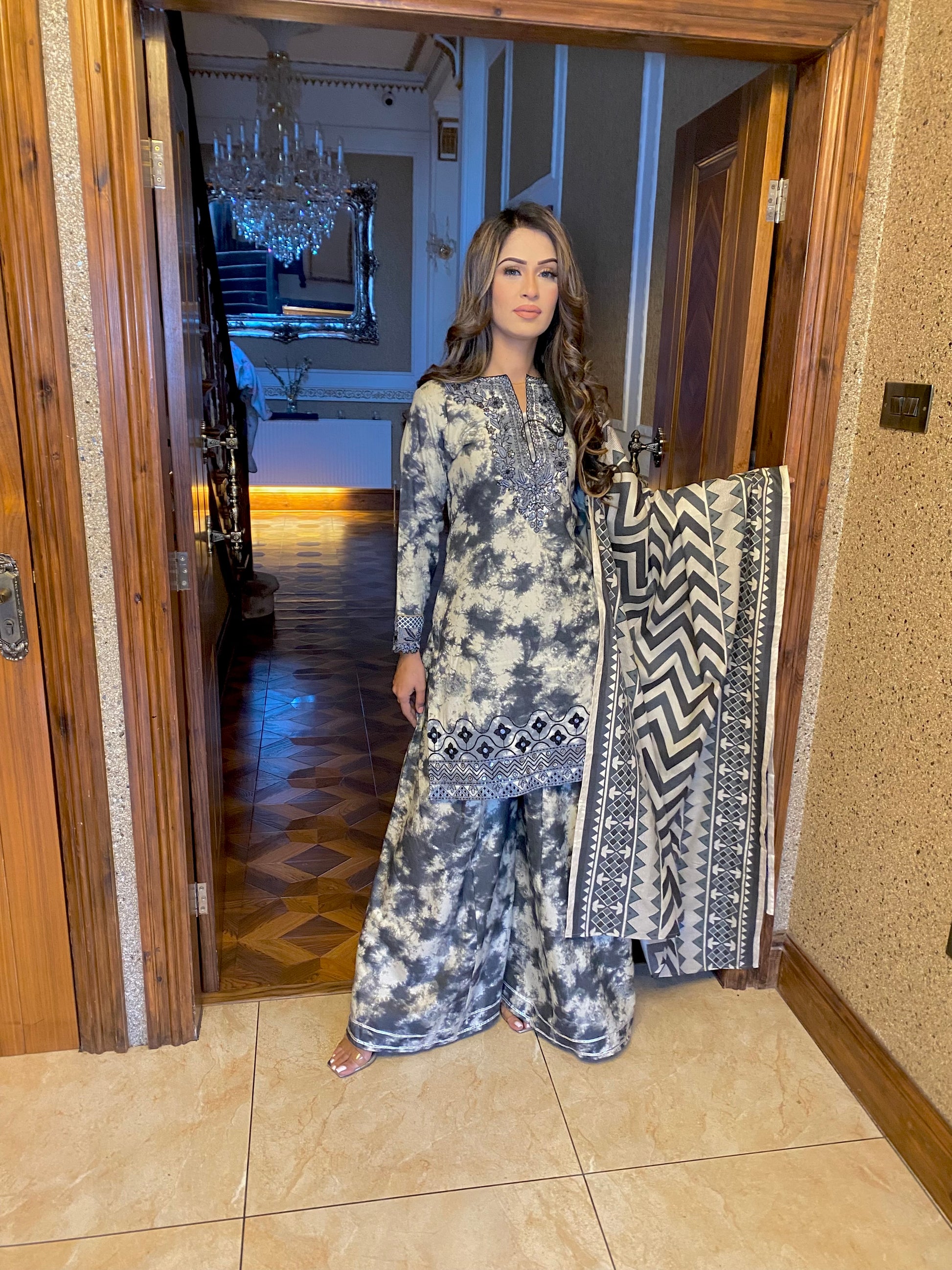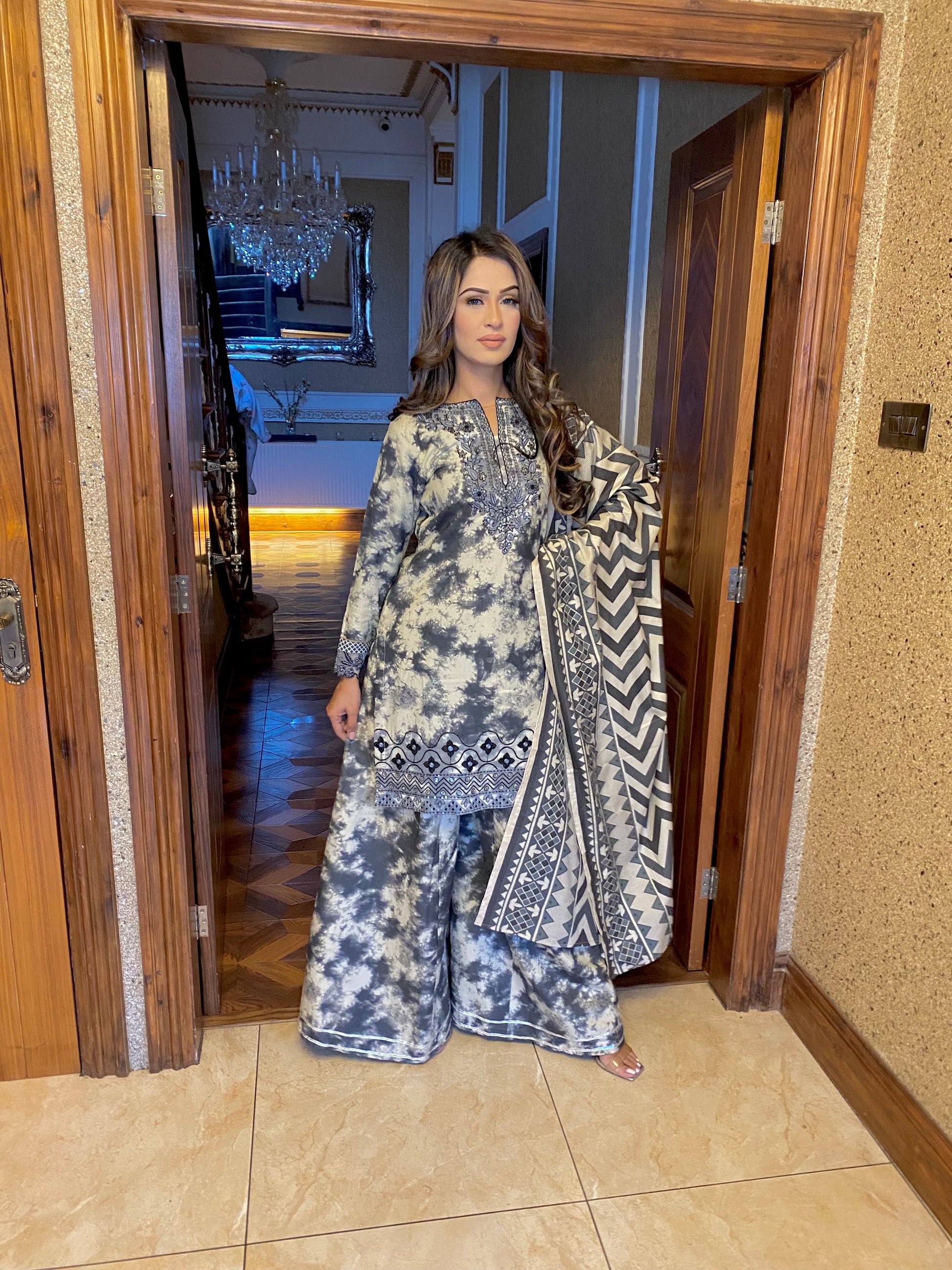 Tie dye printed palazzo trousers finished with a silver lace paired with a printed dhanak scarf