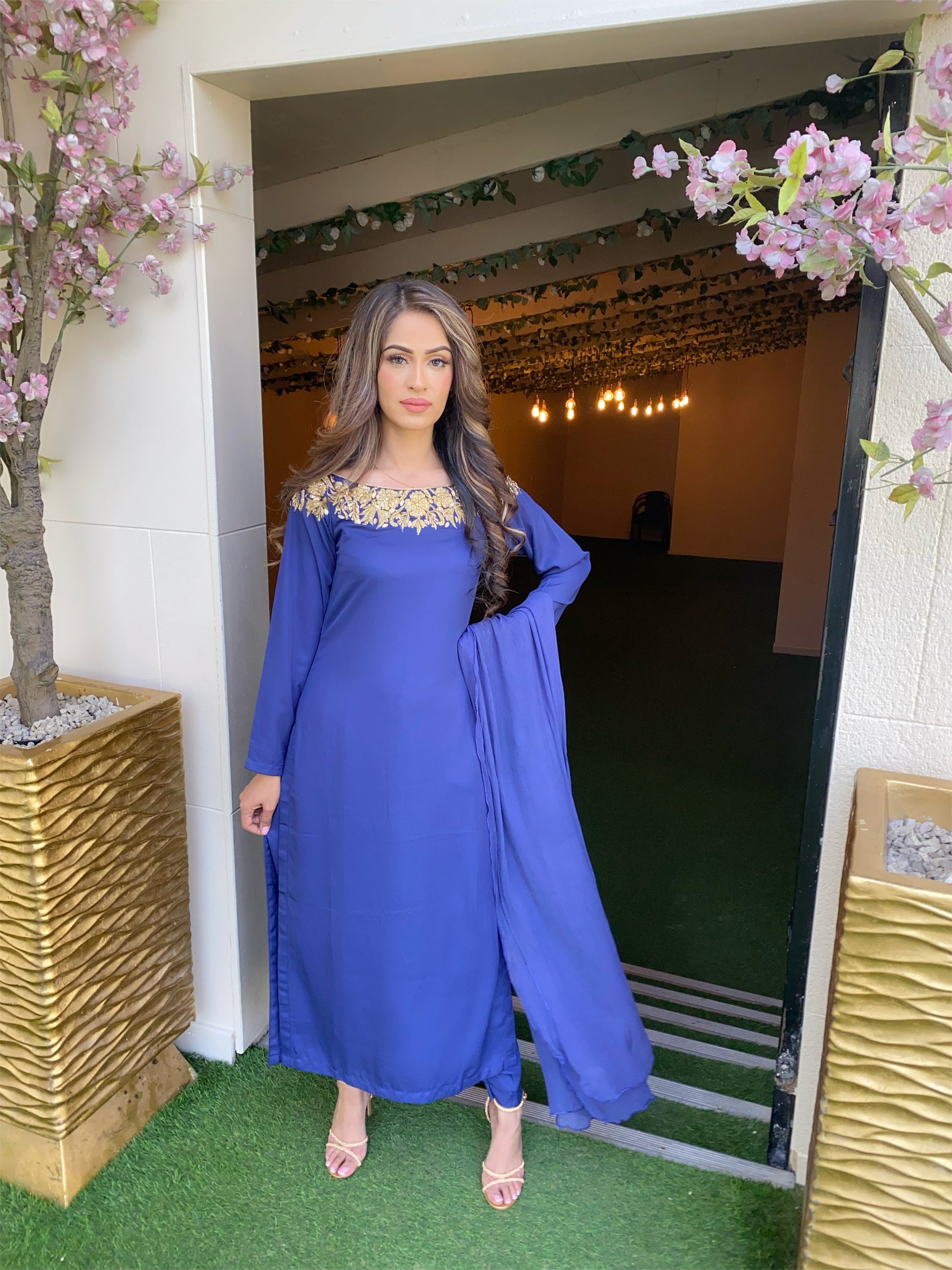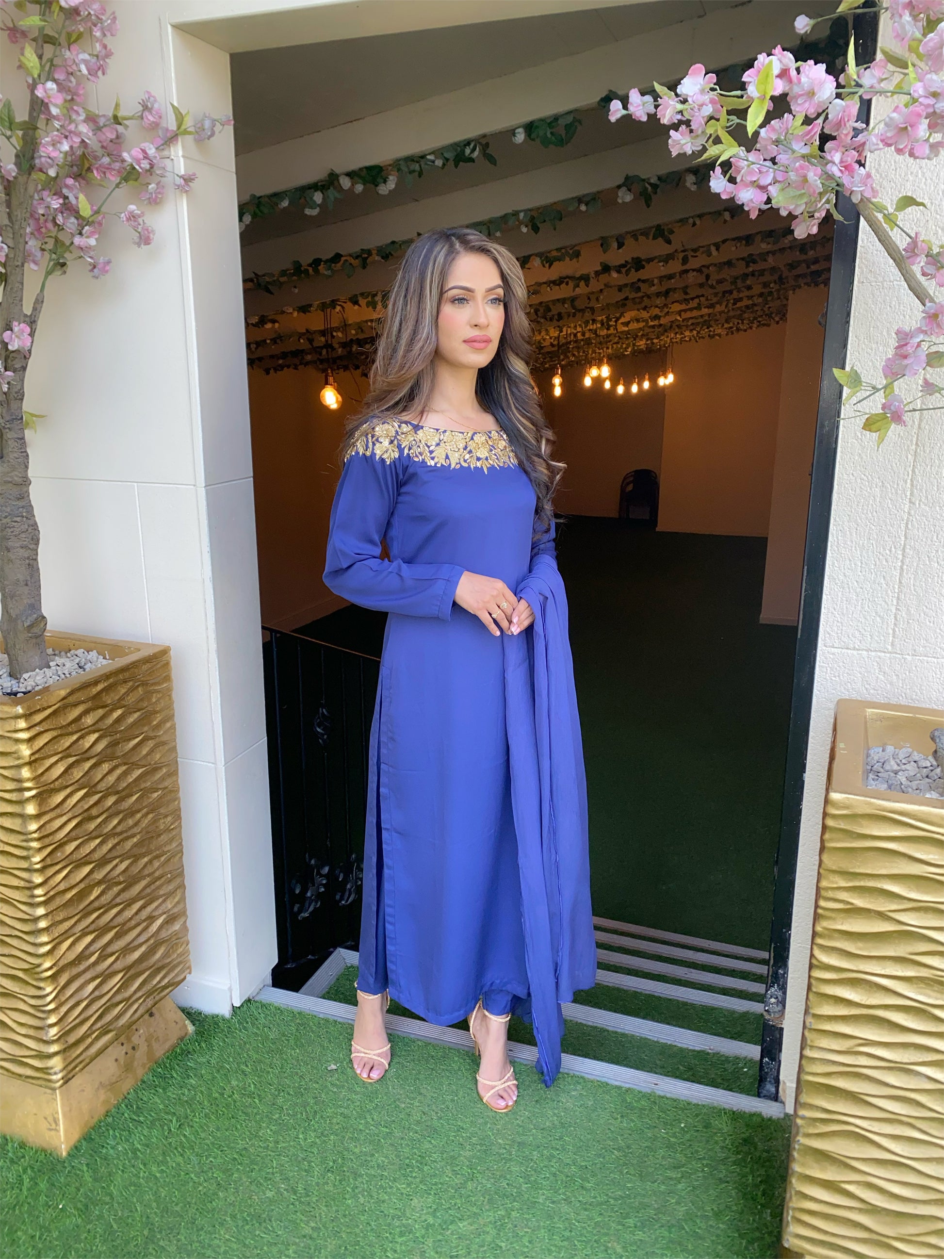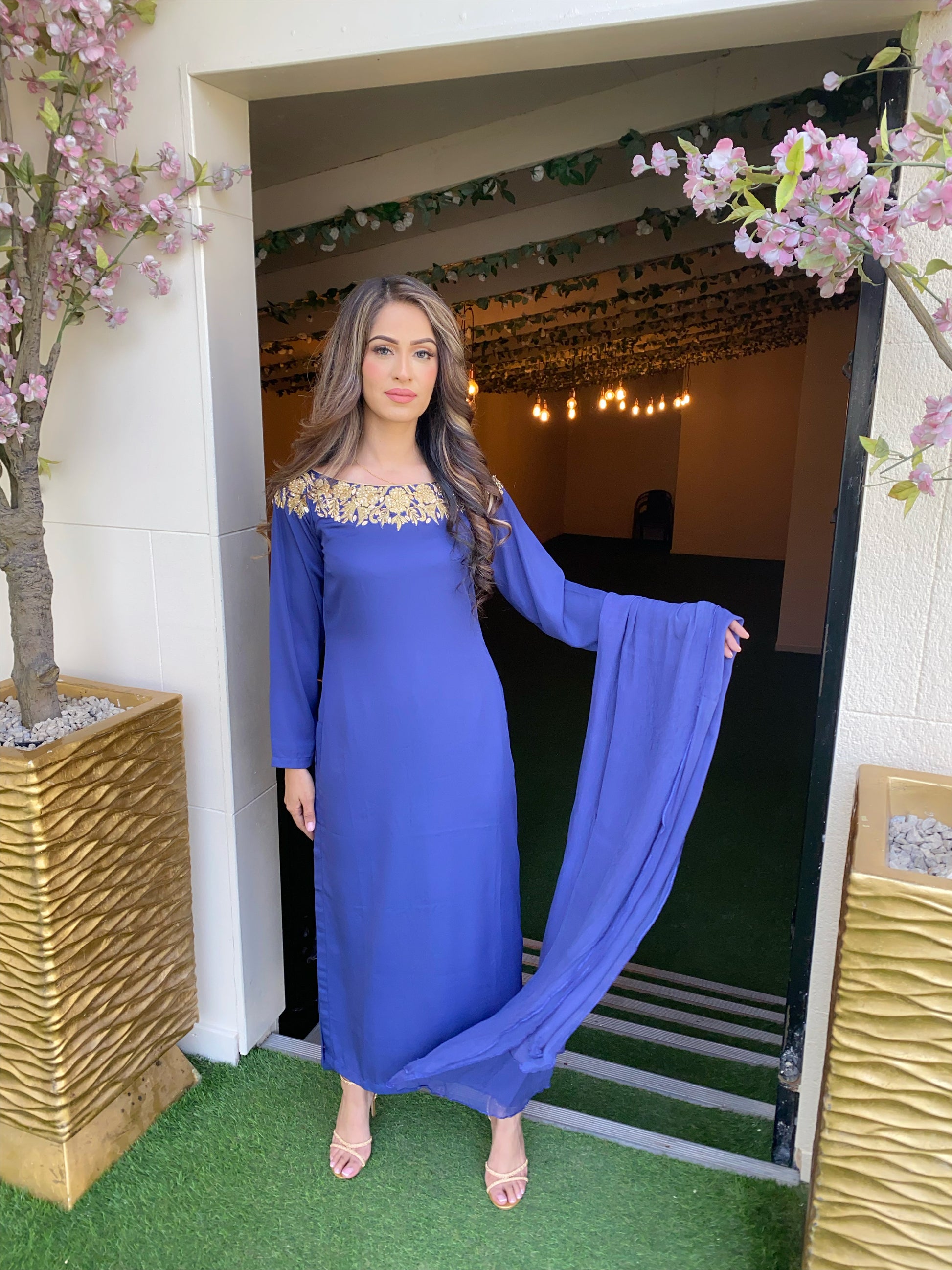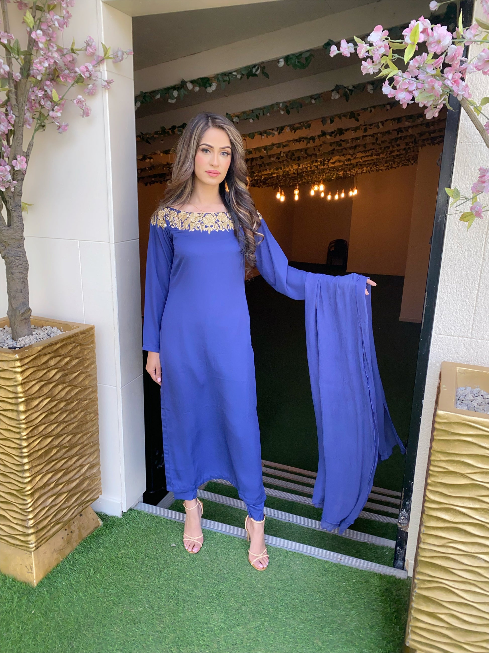 Blue georgette fabric kameez. Boat neck with hand embroidery on the front and back of the neck.